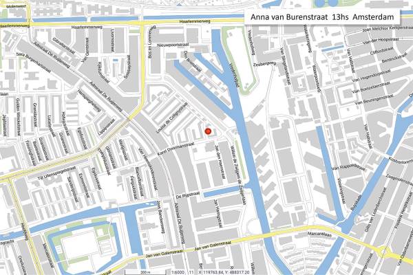 Het adres van deze woning uit 1937 is Anna van Burenstraat 13H te Amsterdam. Het pand heeft een oppervlakte van 53m² en heeft 2 kamers kamers waarvan 1 slaapkamers. De geschatte waarde van deze woning is € 375.000.