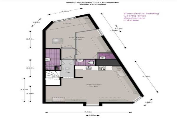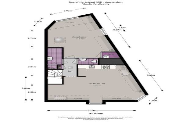 Het adres van deze woning is Roelof Hartstraat 15 te Amsterdam. Het pand heeft een oppervlakte van 72m² en heeft 3 kamers kamers waarvan 2 slaapkamers. De geschatte waarde van deze woning is € 495.000.