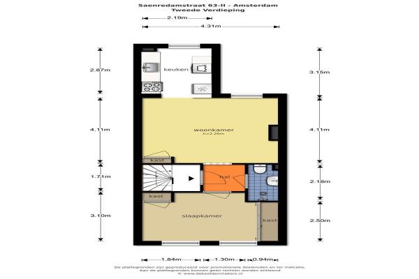 Het adres van deze woning uit 1878 is Saenredamstraat 63II te Amsterdam. Het pand heeft een oppervlakte van 42m² en heeft 2 kamers kamers waarvan 1 slaapkamers. De geschatte waarde van deze woning is € 275.000.