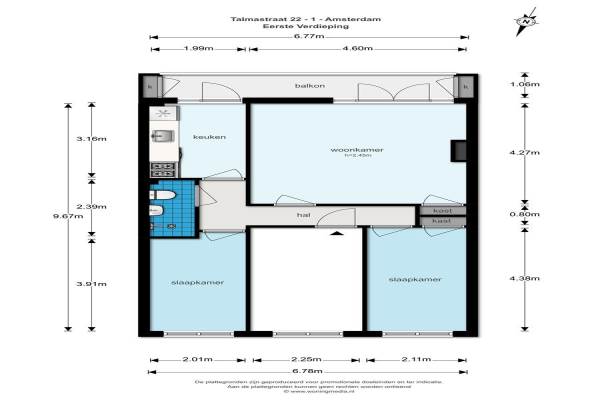 Het adres van deze woning is Talmastraat 22 te Amsterdam. Het pand heeft een oppervlakte van 54m² en heeft 3 kamers kamers waarvan 2 slaapkamers. De geschatte waarde van deze woning is € 325.000.