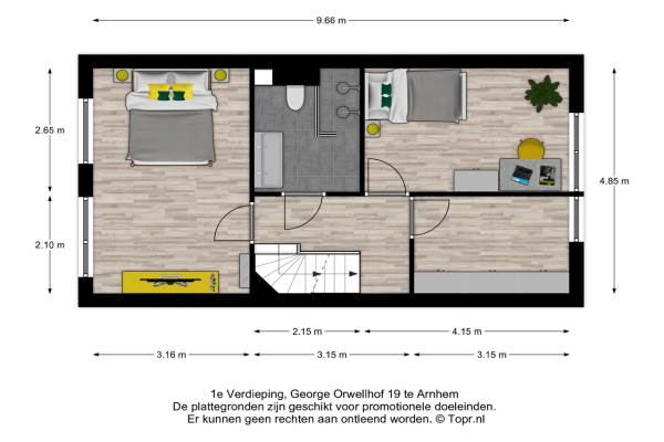 Het adres van deze woning uit 1998 is George Orwellhof 19 te Arnhem. Het pand heeft een oppervlakte van 108m² en een perceeloppervlakte van 131m² en heeft 5 kamers kamers waarvan 4 slaapkamers. De geschatte waarde van deze woning is € 345.000.