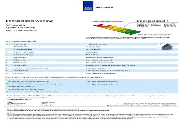 Het adres van deze woning uit 1950 is Ashorst 16 te Groesbeek. Het pand heeft een oppervlakte van 161m² en een perceeloppervlakte van 1230m² en heeft 3 kamers kamers waarvan 1 slaapkamers. De geschatte waarde van deze woning is € 189.000.
