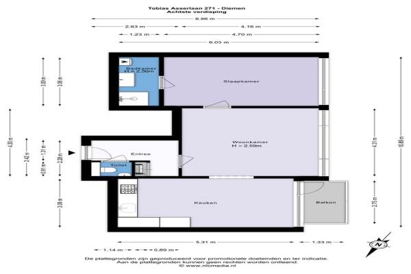 Het adres van deze woning uit 1974 is Tobias Asserlaan 271 te Diemen. Het pand heeft een oppervlakte van 61m² en heeft 3 kamers kamers waarvan 1 slaapkamers. De geschatte waarde van deze woning is € 350.000.