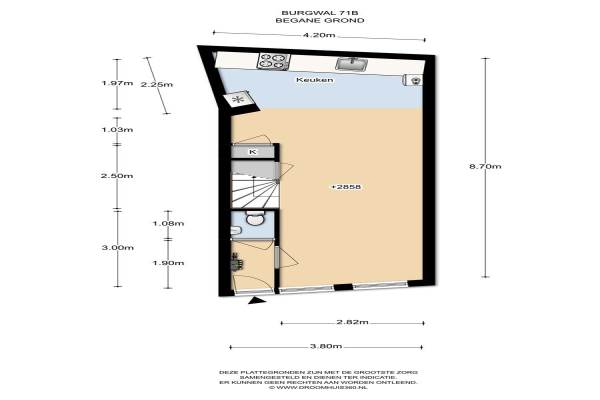 Het adres van deze woning uit 1890 is Burgwal 71B te Haarlem. Het pand heeft een oppervlakte van 61m² en een perceeloppervlakte van 40m² en heeft 2 kamers kamers waarvan 1 slaapkamers. De geschatte waarde van deze woning is € 269.000.
