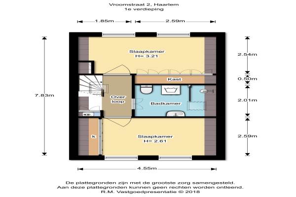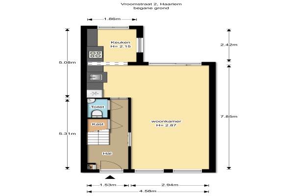 Het adres van deze woning uit 1900 is Vroomstraat 2 te Haarlem. Het pand heeft een oppervlakte van 77m² en een perceeloppervlakte van 88m² en heeft 3 kamers kamers waarvan 2 slaapkamers. De geschatte waarde van deze woning is € 298.000.