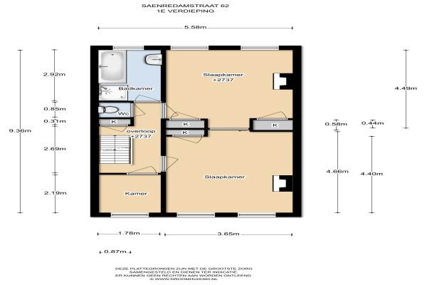 Het adres van deze woning is Saenredamstraat 62 te Haarlem. Het pand heeft een oppervlakte van 173m² en een perceeloppervlakte van 168m² en heeft 6 kamers kamers waarvan 5 slaapkamers. De geschatte waarde van deze woning is € 475.000.