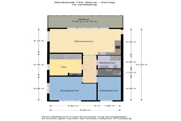 Het adres van deze woning uit 2005 is Sarabande 144 te Nieuw-Vennep. Het pand heeft een oppervlakte van 65m² en heeft 3 kamers kamers waarvan 2 slaapkamers. De geschatte waarde van deze woning is € 215.000.