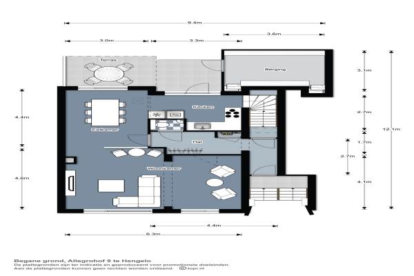 Het adres van deze woning uit 1956 is Allegrohof 9 te Hengelo. Het pand heeft een oppervlakte van 158m² en een perceeloppervlakte van 158m² en heeft 6 kamers kamers waarvan 4 slaapkamers. De geschatte waarde van deze woning is € 209.000.