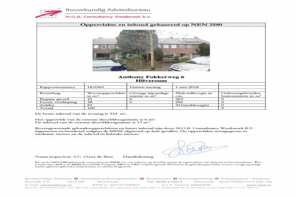 Het adres van deze woning uit 1950 is Anthony Fokkerweg 6 te Hilversum. Het pand heeft een oppervlakte van 100m² en een perceeloppervlakte van 129m² en heeft 4 kamers kamers waarvan 3 slaapkamers. De geschatte waarde van deze woning is € 259.000.