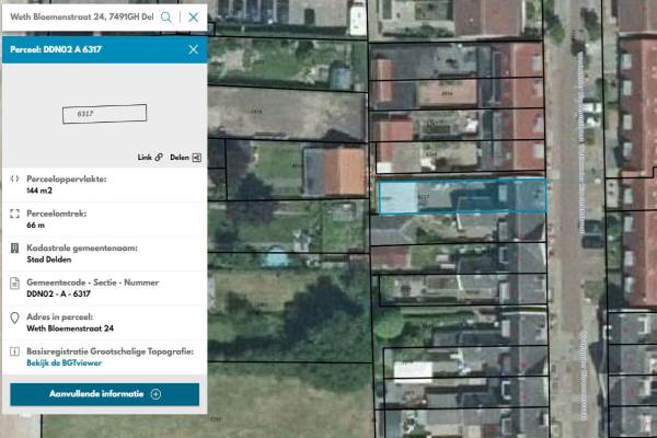 Het adres van deze woning uit 1935 is Weth Bloemenstraat 24 te Delden. Het pand heeft een oppervlakte van 80m² en een perceeloppervlakte van 144m² en heeft 4 kamers kamers waarvan 3 slaapkamers. De geschatte waarde van deze woning is € 169.000.