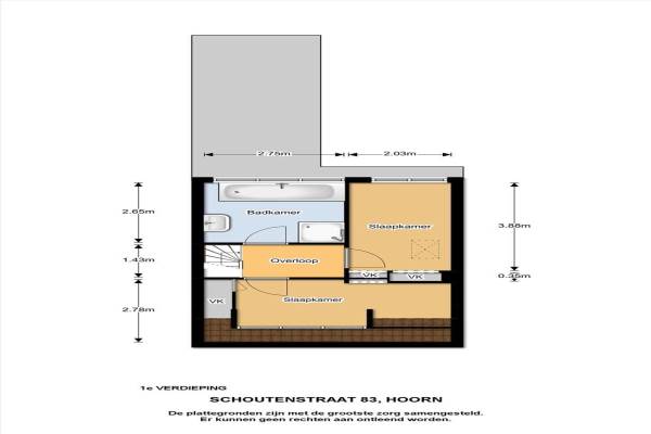 Het adres van deze woning uit 1935 is Schoutenstraat 83 te Hoorn Nh. Het pand heeft een oppervlakte van 70m² en een perceeloppervlakte van 153m² en heeft 4 kamers kamers waarvan 2 slaapkamers. De geschatte waarde van deze woning is € 250.000.