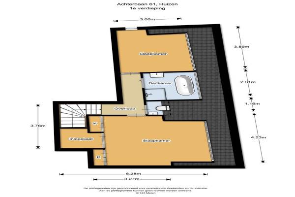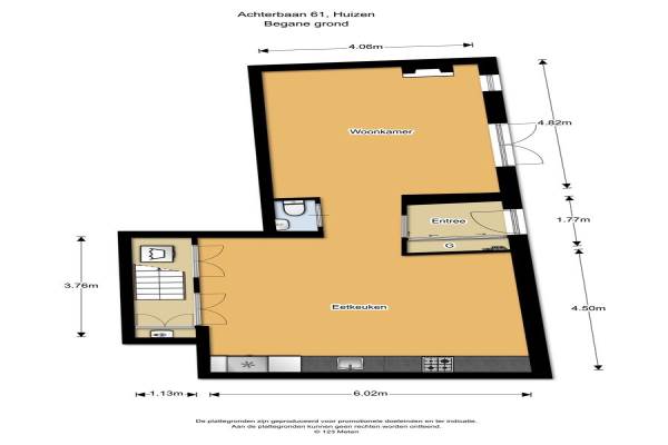 Het adres van deze woning uit 1912 is Achterbaan 61 te Huizen. Het pand heeft een oppervlakte van 107m² en een perceeloppervlakte van 214m² en heeft 4 kamers kamers waarvan 2 slaapkamers. De geschatte waarde van deze woning is € 415.000.