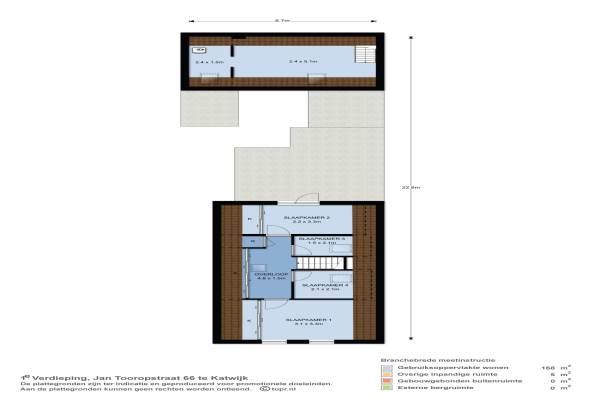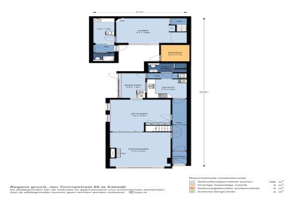 Het adres van deze woning uit 1913 is Jan Tooropstraat 66 te Katwijk. Het pand heeft een oppervlakte van 168m² en een perceeloppervlakte van 159m² en heeft 8 kamers kamers waarvan 5 slaapkamers. De geschatte waarde van deze woning is € 309.000.