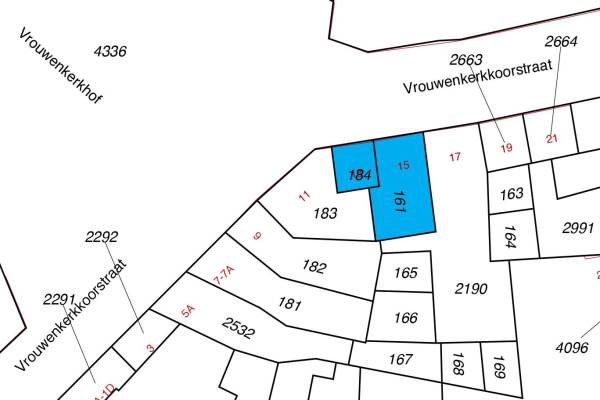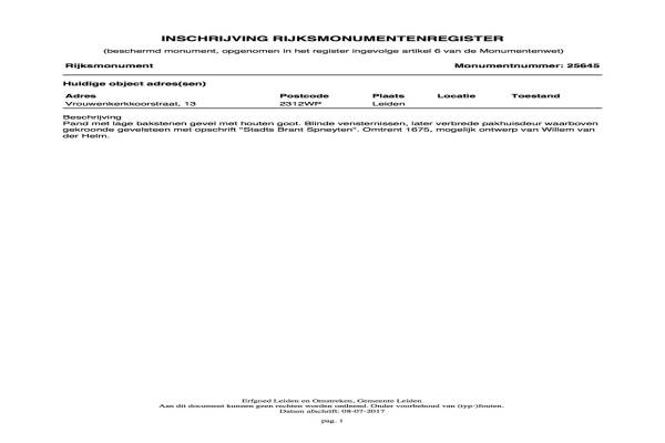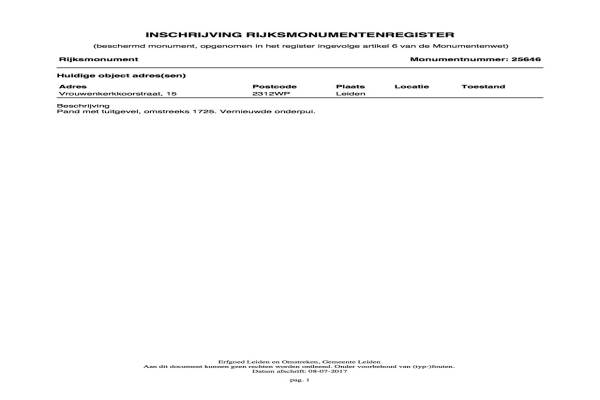 Het adres van deze woning uit 1725 is Vrouwenkerkkoorstraat 13& 15 te Leiden. Het pand heeft een oppervlakte van 102m² en een perceeloppervlakte van 69m² en heeft 4 kamers kamers waarvan 3 slaapkamers. De geschatte waarde van deze woning is € 475.000.