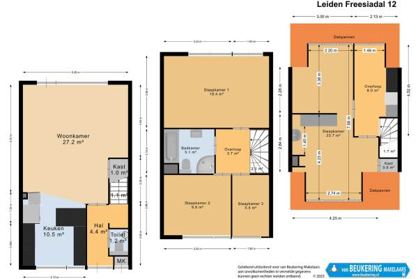 Het adres van deze woning uit 1974 is Freesiadal 12 te Leiden. Het pand heeft een oppervlakte van 127m² en een perceeloppervlakte van 155m² en heeft 5 kamers kamers waarvan 4 slaapkamers. De geschatte waarde van deze woning is € 475.000.