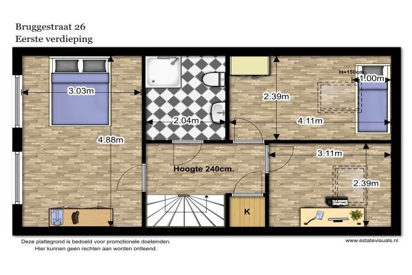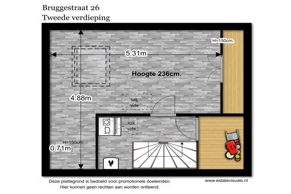 Het adres van deze woning uit 1979 is Bruggestraat 26 te Leiden. Het pand heeft een oppervlakte van 106m² en een perceeloppervlakte van 120m² en heeft 5 kamers kamers waarvan 4 slaapkamers. De geschatte waarde van deze woning is € 325.000.