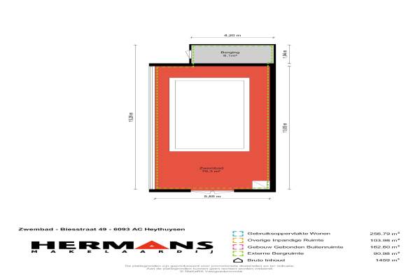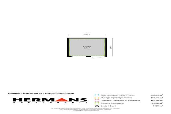 Het adres van deze woning uit 1932 is Biesstraat 49 te Heythuysen. Het pand heeft een oppervlakte van 256m² en een perceeloppervlakte van 1669m² en heeft 8 kamers kamers. De geschatte waarde van deze woning is € 409.000.