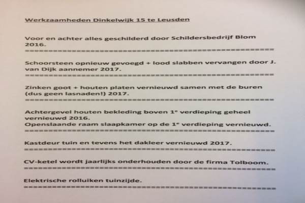 Het adres van deze woning uit 1978 is Dinkelwijk 15 te Leusden. Het pand heeft een oppervlakte van 111m² en een perceeloppervlakte van 132m² en heeft 5 kamers kamers waarvan 4 slaapkamers. De geschatte waarde van deze woning is € 265.000.