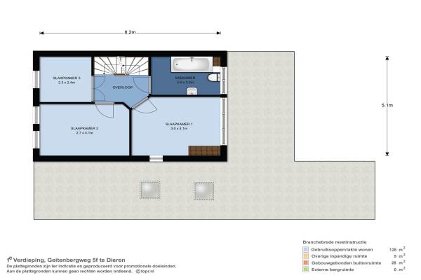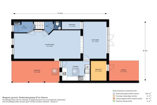 Het adres van deze woning uit 1995 is Geitenbergweg 5 te Dieren. Het pand heeft een oppervlakte van 126m² en een perceeloppervlakte van 227m² en heeft 6 kamers kamers waarvan 4 slaapkamers. De geschatte waarde van deze woning is € 239.500.