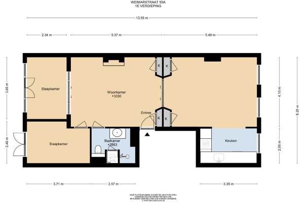Het adres van deze woning uit 1896 is Weimarstraat 55A te Den Haag. Het pand heeft een oppervlakte van 77m² en heeft 4 kamers kamers waarvan 2 slaapkamers. De geschatte waarde van deze woning is € 419.000.