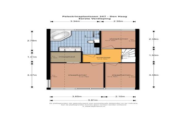 Het adres van deze woning uit 1978 is Palestrinaplantsoen 347 te Den Haag. Het pand heeft een oppervlakte van 96m² en een perceeloppervlakte van 128m² en heeft 5 kamers kamers waarvan 3 slaapkamers. De geschatte waarde van deze woning is € 279.500.