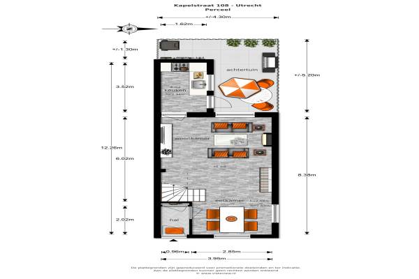 Het adres van deze woning is Kapelstraat 108 te Utrecht. Het pand heeft een oppervlakte van 72m² en een perceeloppervlakte van 61m² en heeft 3 kamers kamers waarvan 2 slaapkamers. De geschatte waarde van deze woning is € 270.000.