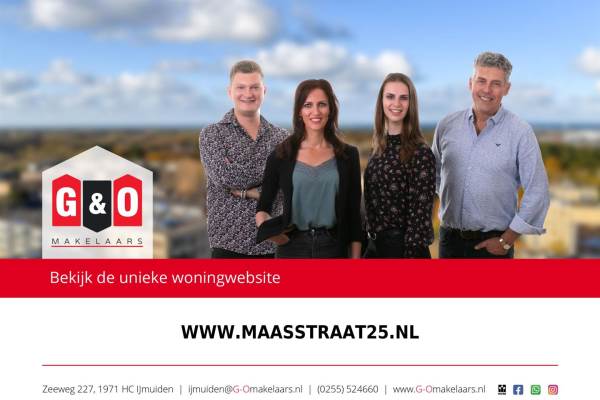 Het adres van deze woning uit 1955 is Maasstraat 25 te IJmuiden. Het pand heeft een oppervlakte van 128m² en een perceeloppervlakte van 262m² en heeft 5 kamers kamers waarvan 4 slaapkamers. De geschatte waarde van deze woning is € 585.000.
